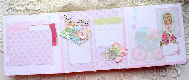 Сегодня показываю свое новое творение - альбом с первыми фотографиями нашей племяшки Сонечки. Альбомчик сотворился из бумаги Тамары Старцевой "Милая коллекция", которая лежала у меня очень давно и ждала своего часа. А поскольку базовых листов в наборе было всего 4, остальное карточки, то решила использовать экономную раскладку по МК Татьяны Берсеневой. Получилось 5 разворотов, но с обложкой я немного накосячила - корешок получился чуть шире переплета, пришлось добавлять еще один разворот, бумагу взяла уже такую, какая была и больше подходила по цвету. Итак, смотрим.